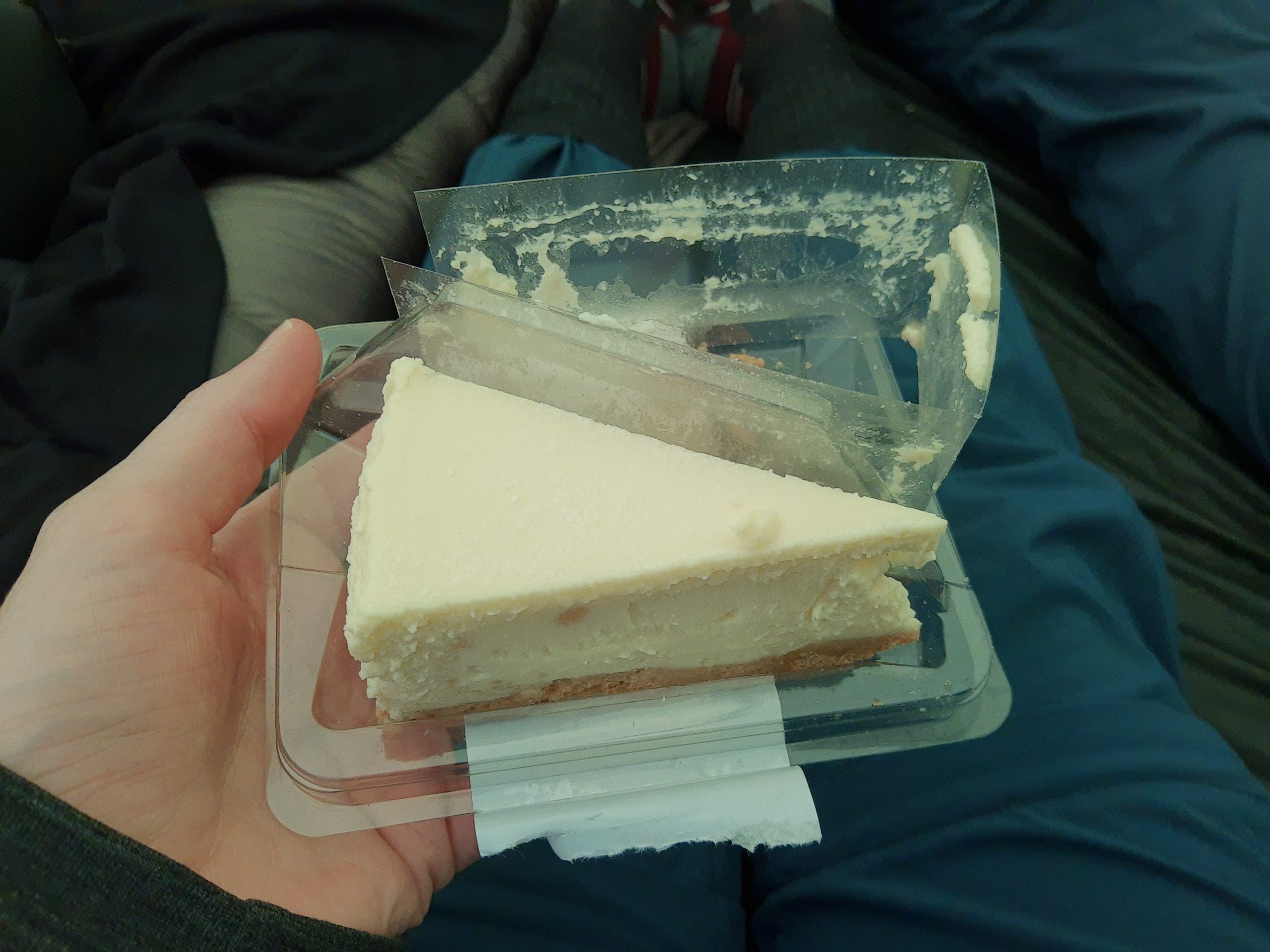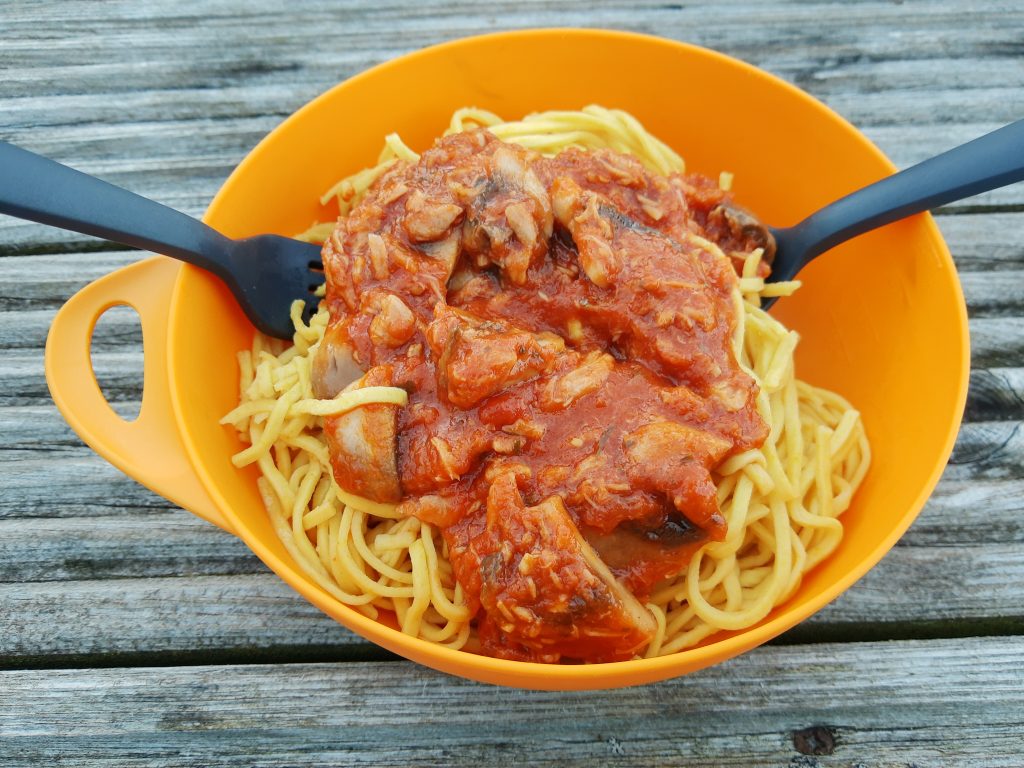Zum Abschluss des Tages gab es Mie-Nudeln (müssen nicht kochen, sparen Brennstoff) mit Arrabiatasauce, die wir mit Thunfisch und Champignons angereichert hatten. Und zum Nachtisch ein Stück Cheesecake.