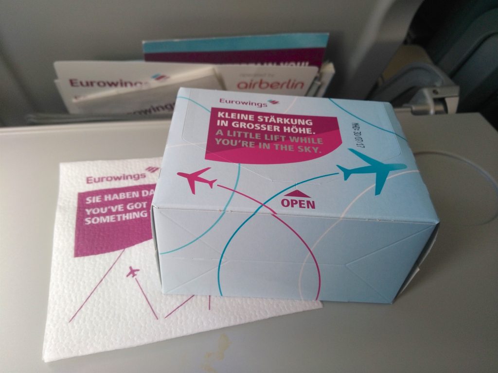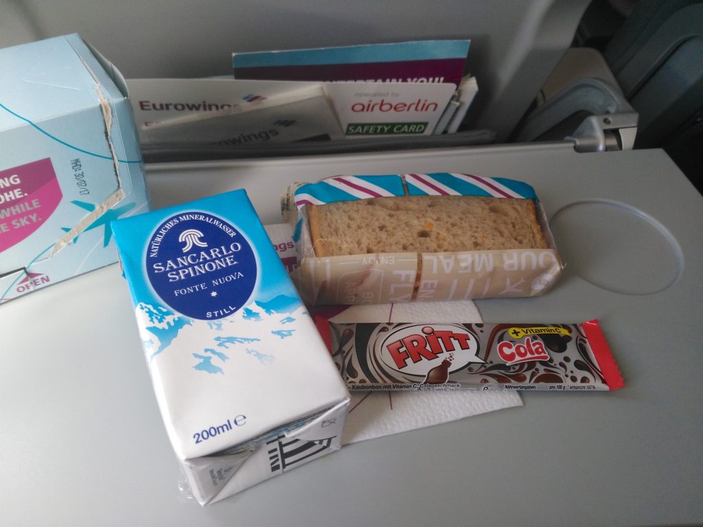Der Flug verlief abgesehen von der Verspätung mit einer Ausnahme ereignislos. Ich habe die Zeit genutzt und ein paar Bilder gemacht – der inkludierte Snack kam heute in einer lustigen Pappbox und als Zugabe zum Sandwich und Wasser gab es ein ziemlich seltsames Cola-Kaubonbon.