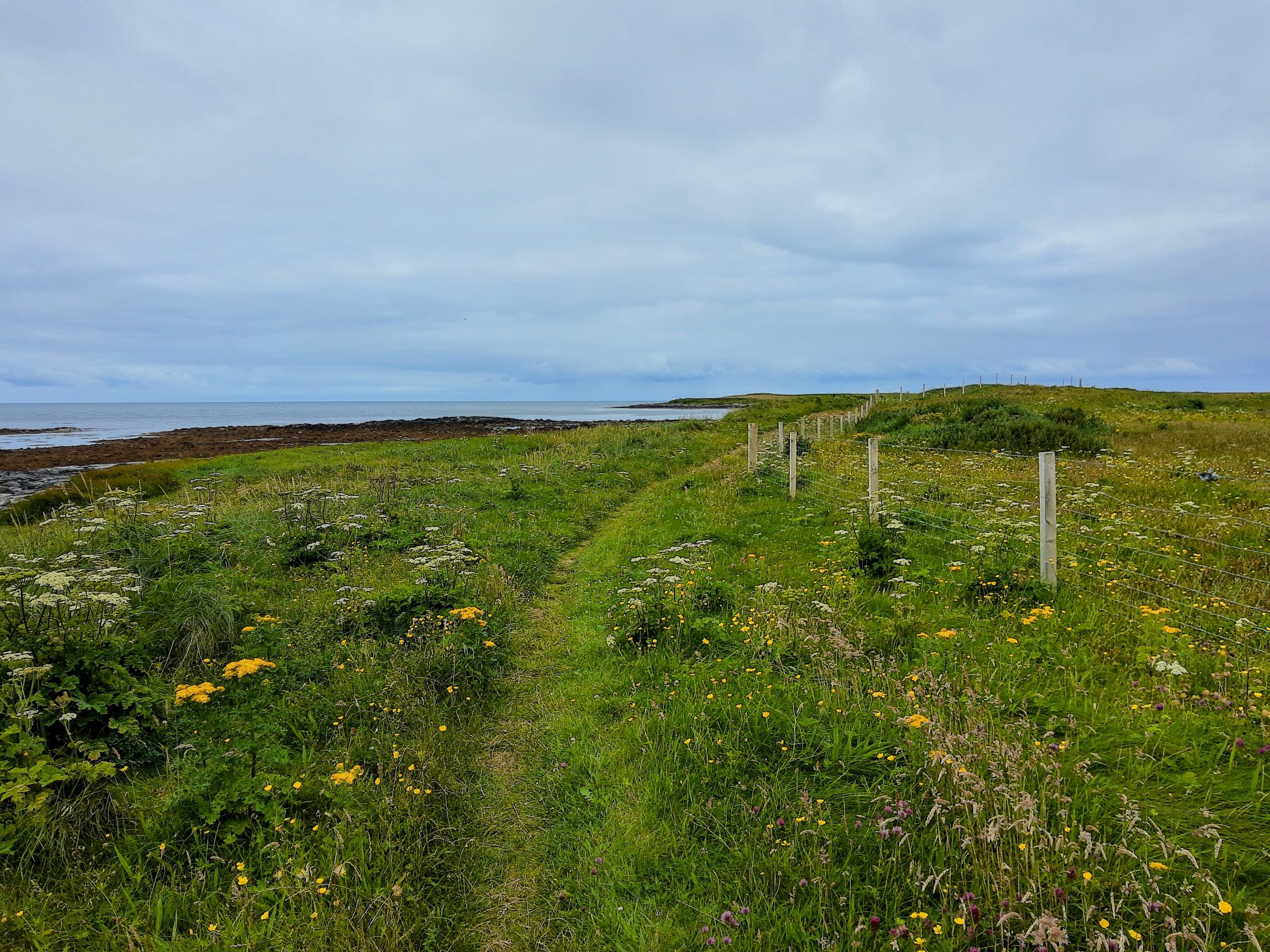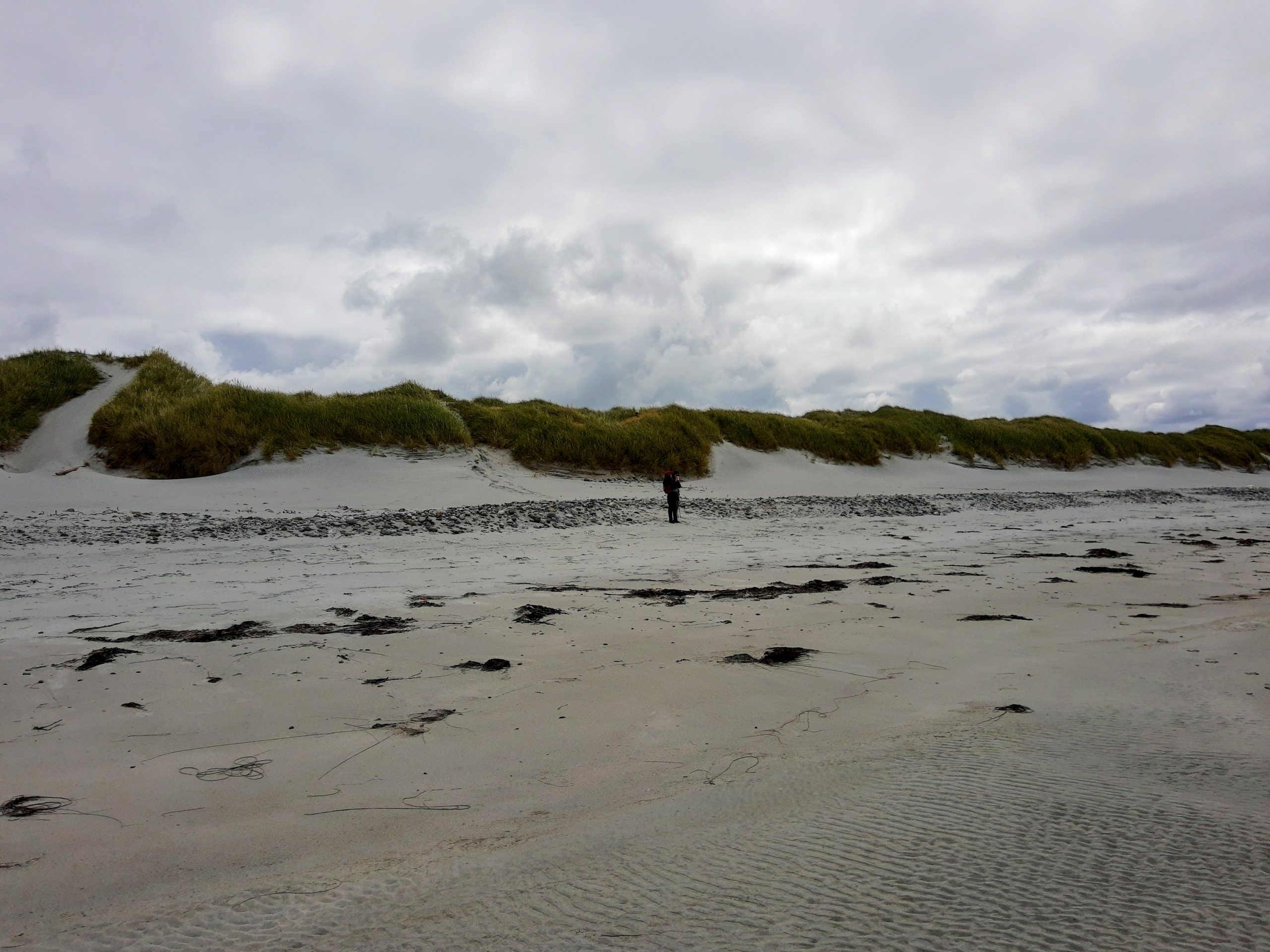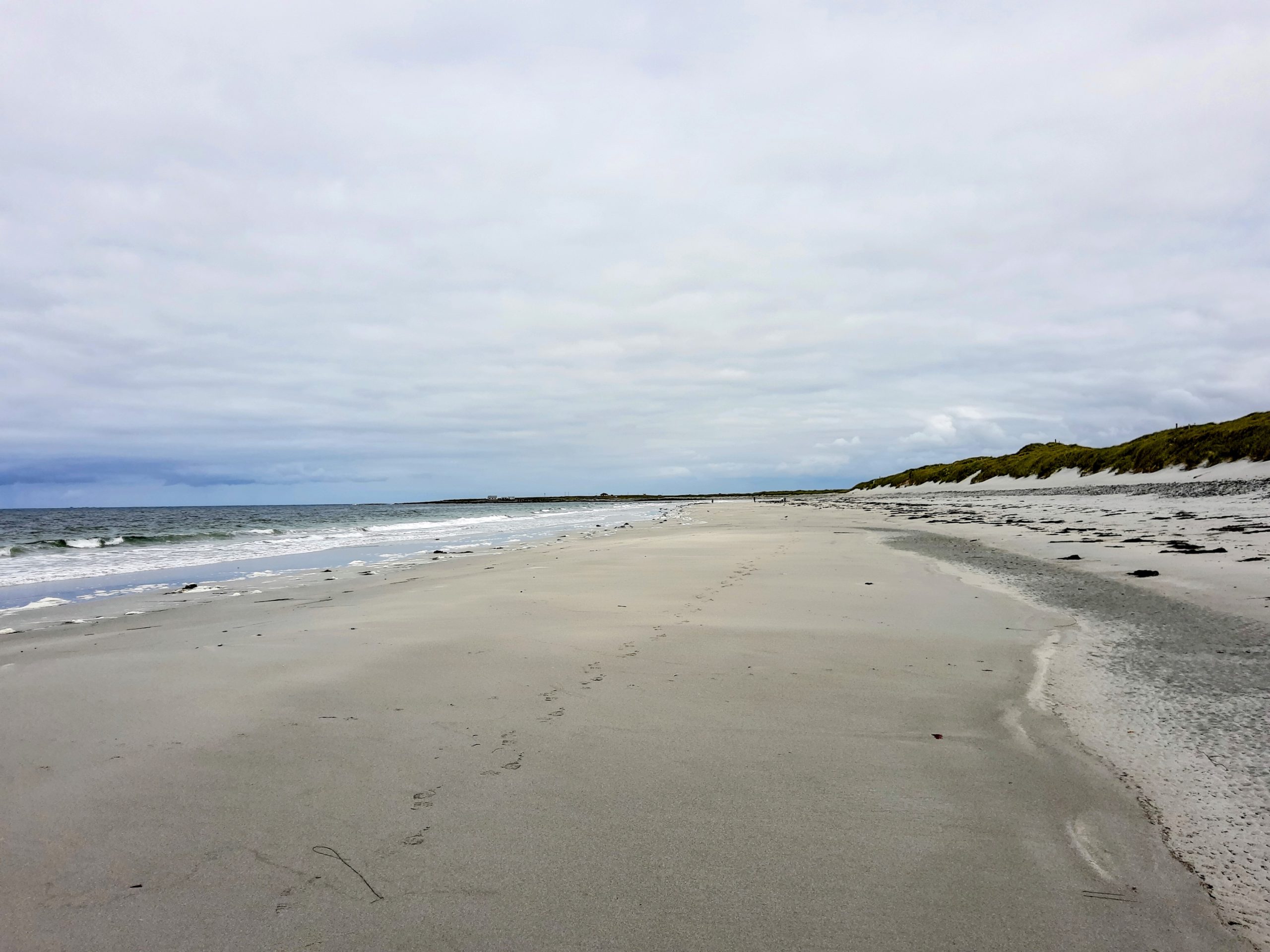 Vom Otter’s Edge Campground sind wir gegen halb elf gestartet. Zunächst mussten wir ein bisschen suchen, bis wir den Hebridean Way wieder gefunden haben. Da der Weg durch die Dünen sehr sandig war und zudem durch höheres Gras verlief, sind wir schnell vom Weg auf den Strand gewechselt. Dort kamen wir sehr gut voran.