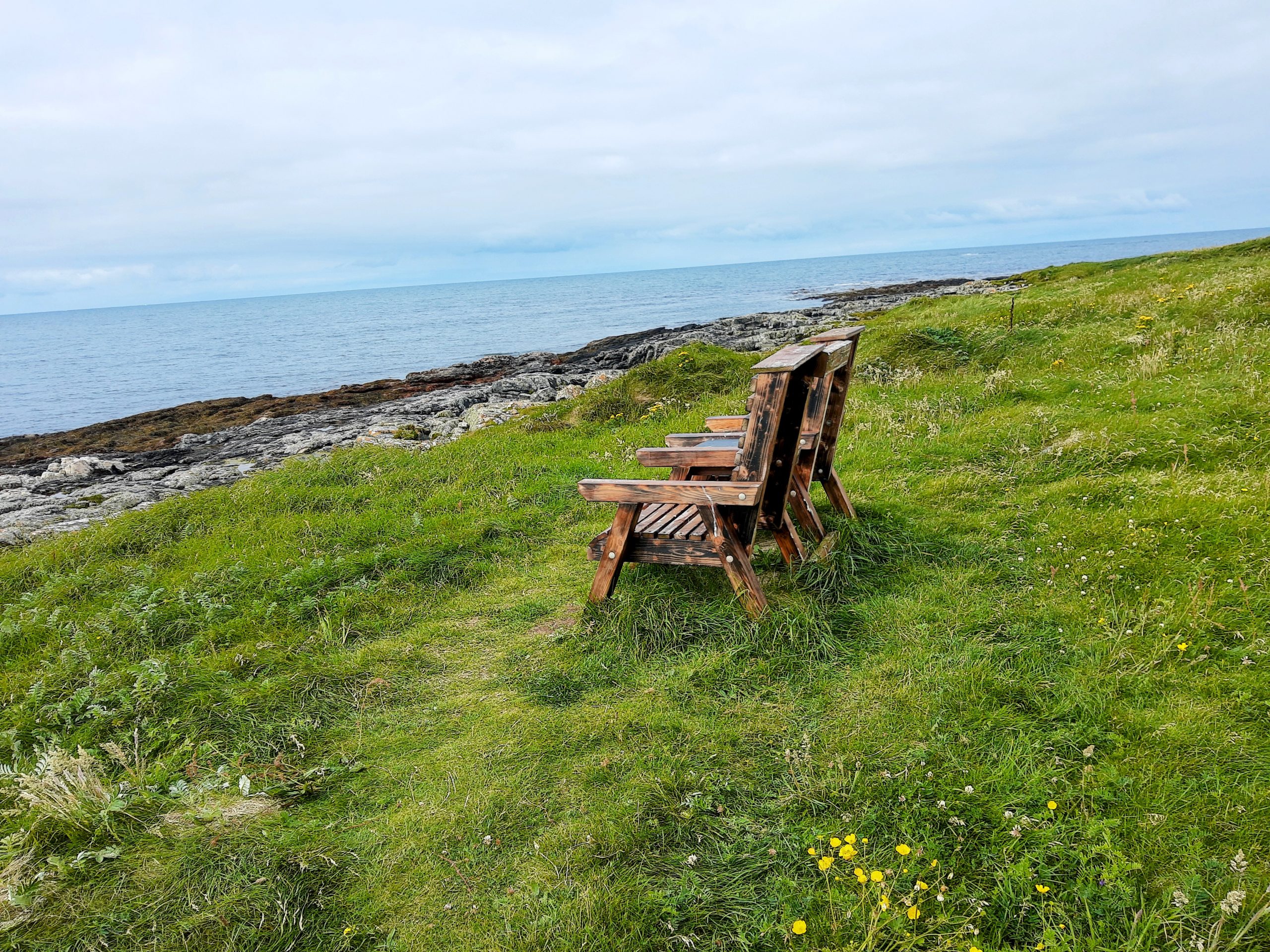 An einer Bank mit schönem Blick auf das Meer haben wir eine kleine Pause gemacht, um unsere Regenjacken auszuziehen. Es war in der Sonne doch recht warm, wenn man sich bewegt hat.