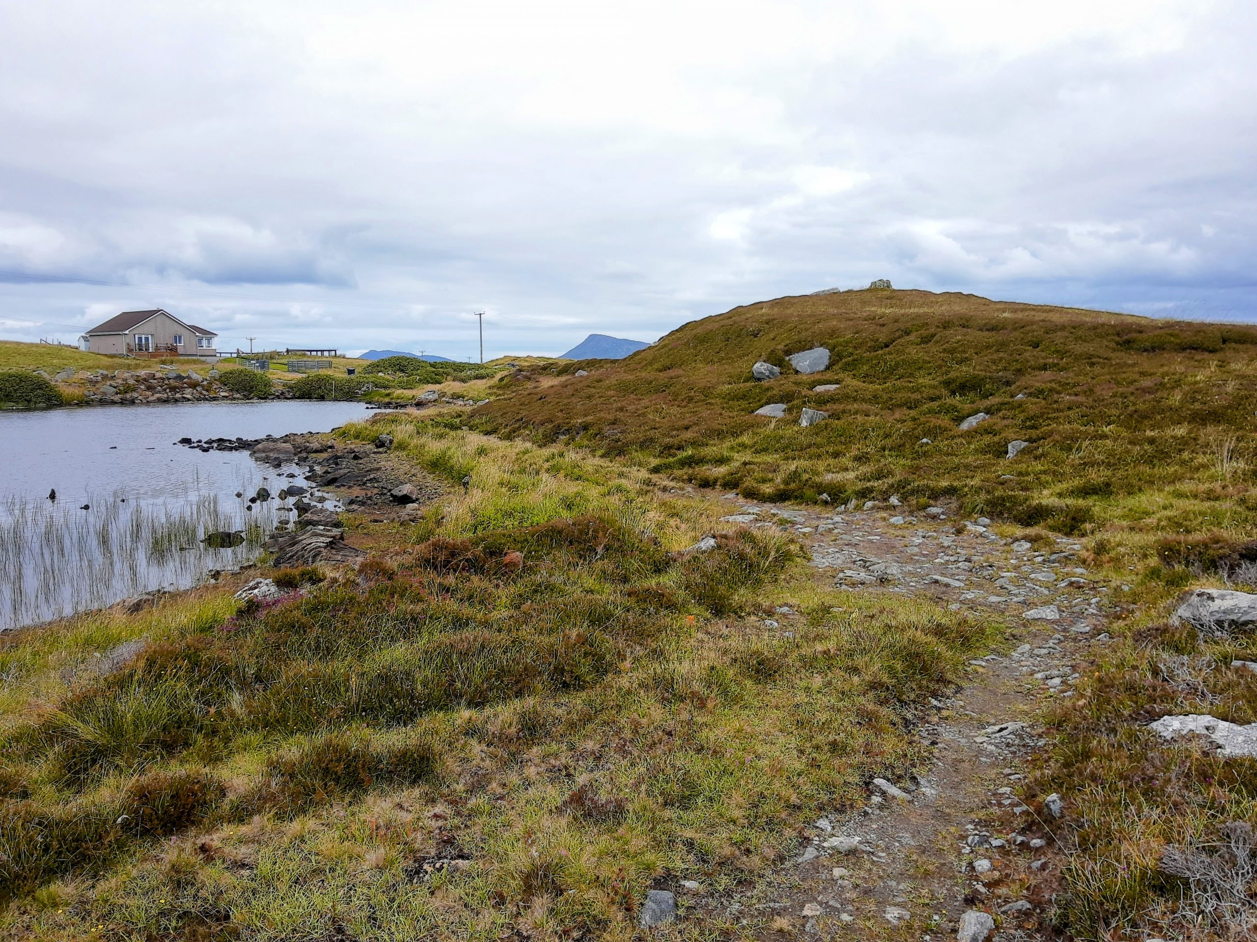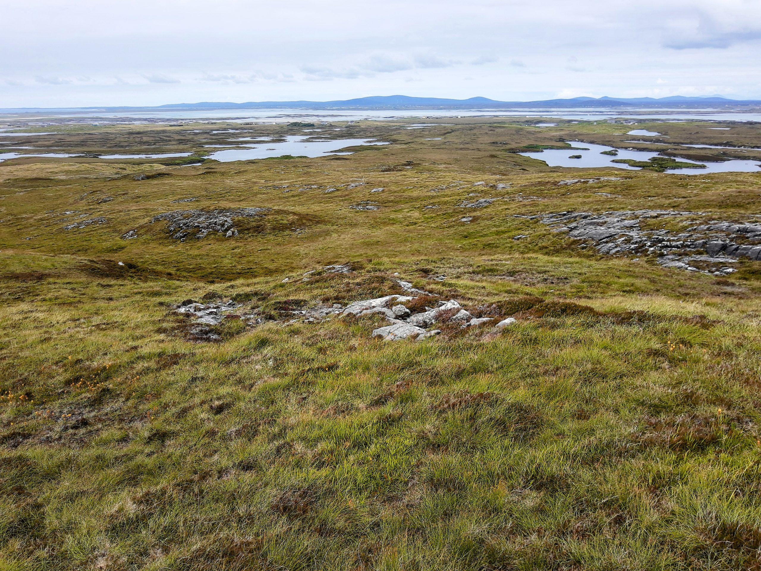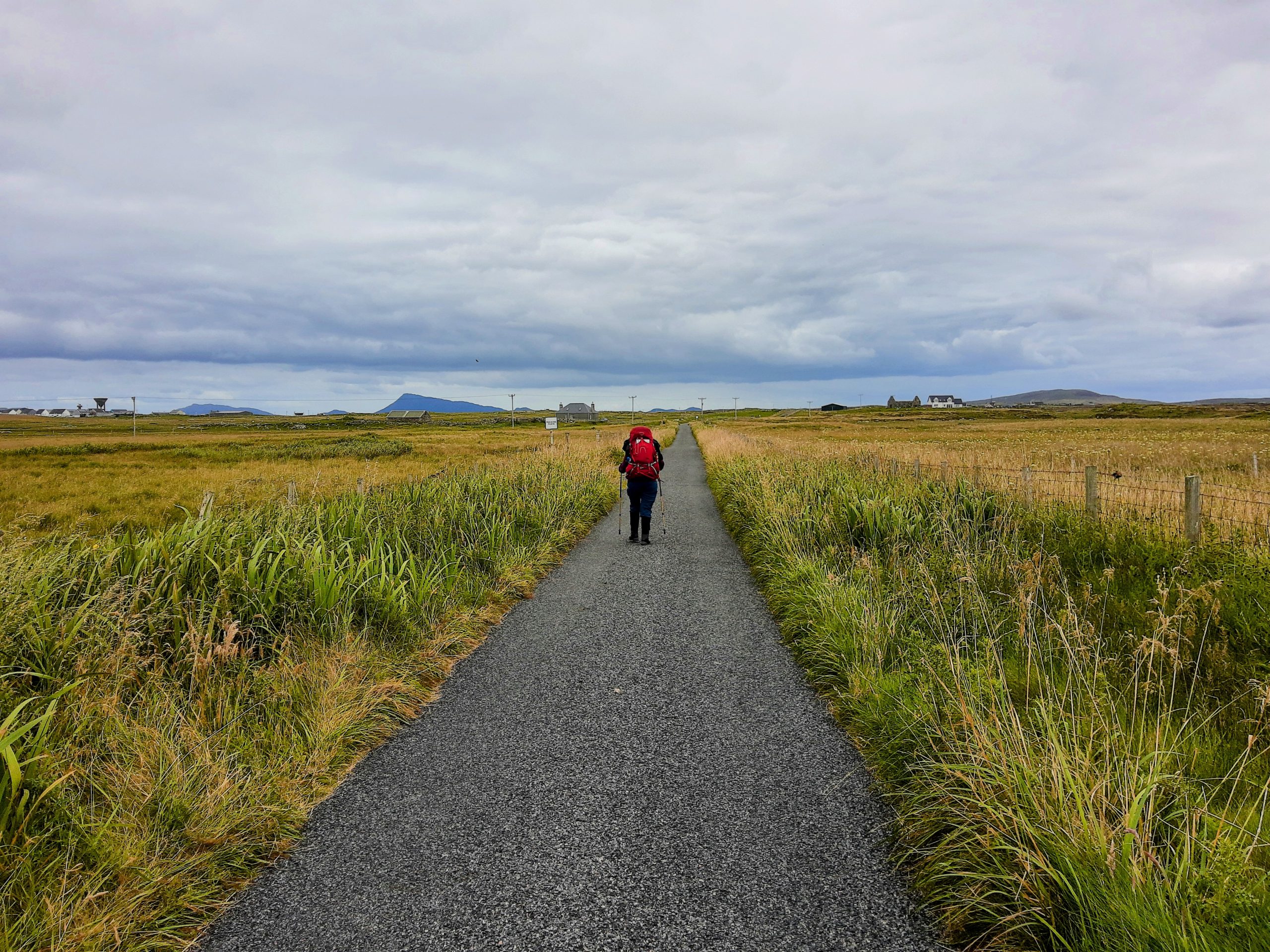 Hinter Nunton hatten wir leider fast 7 km road walking zu bewältigen, bevor es auf einem breiten Track weiter zum Fuße des Ruabhal, der mit 124m höchsten Erhebung von Benbecula, ging. Am Anfang des Tracks trafen wir den älteren Herrn wieder, mir dem wir schon vormittags geplaudert hatten. Er fragte uns, ob wir auf den Hügel rauf und auf dieser Seite auch wieder runterkommen wollten. Als wir verneinten und sagten, dass wir auf der anderen Seite wieder runter gehen würden, sagte er es sei anstrengend und ein Abenteuer.