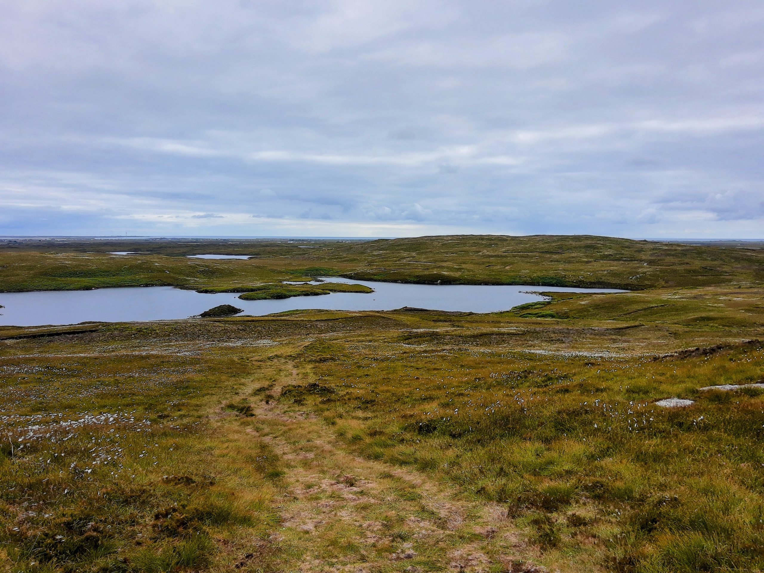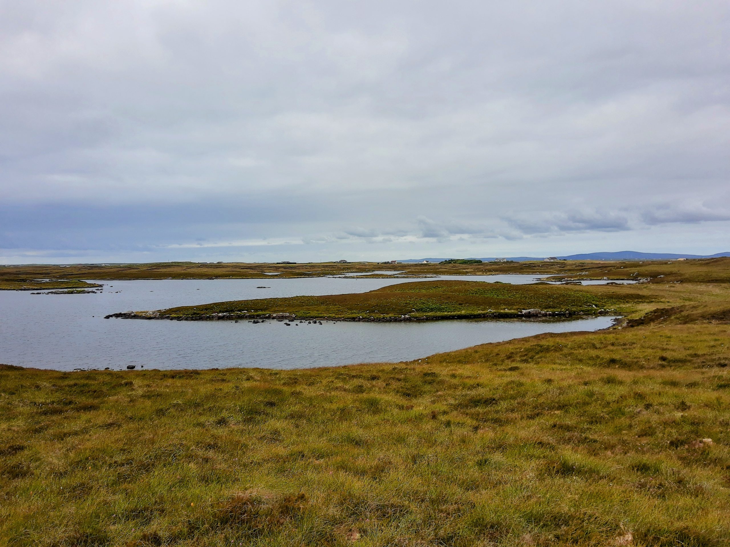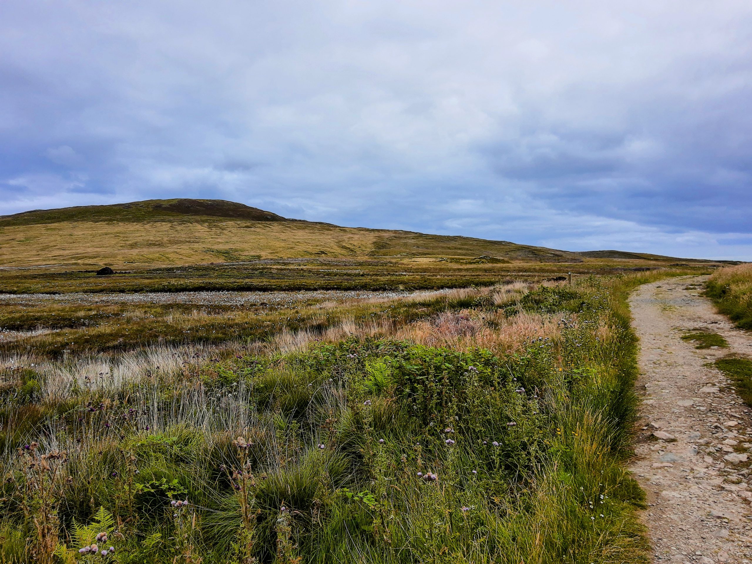 Hinter Nunton hatten wir leider fast 7 km road walking zu bewältigen, bevor es auf einem breiten Track weiter zum Fuße des Ruabhal, der mit 124m höchsten Erhebung von Benbecula, ging. Am Anfang des Tracks trafen wir den älteren Herrn wieder, mir dem wir schon vormittags geplaudert hatten. Er fragte uns, ob wir auf den Hügel rauf und auf dieser Seite auch wieder runterkommen wollten. Als wir verneinten und sagten, dass wir auf der anderen Seite wieder runter gehen würden, sagte er es sei anstrengend und ein Abenteuer.