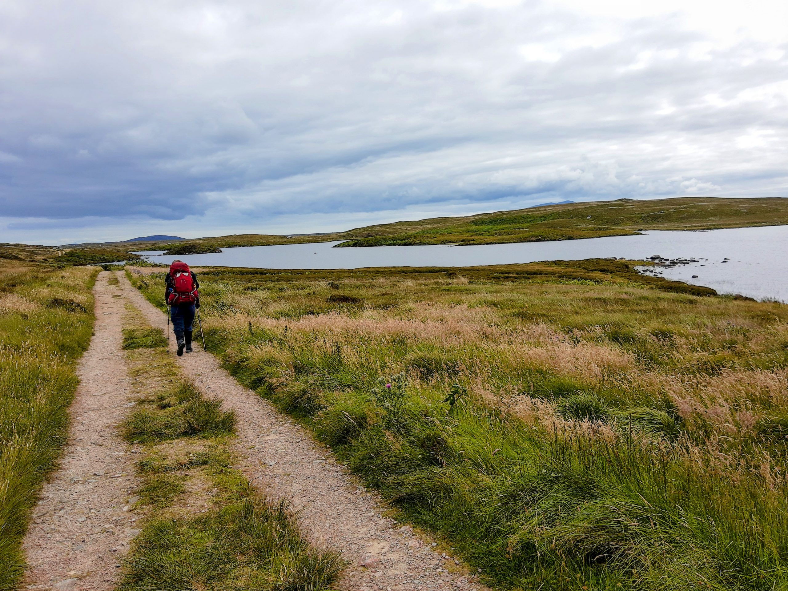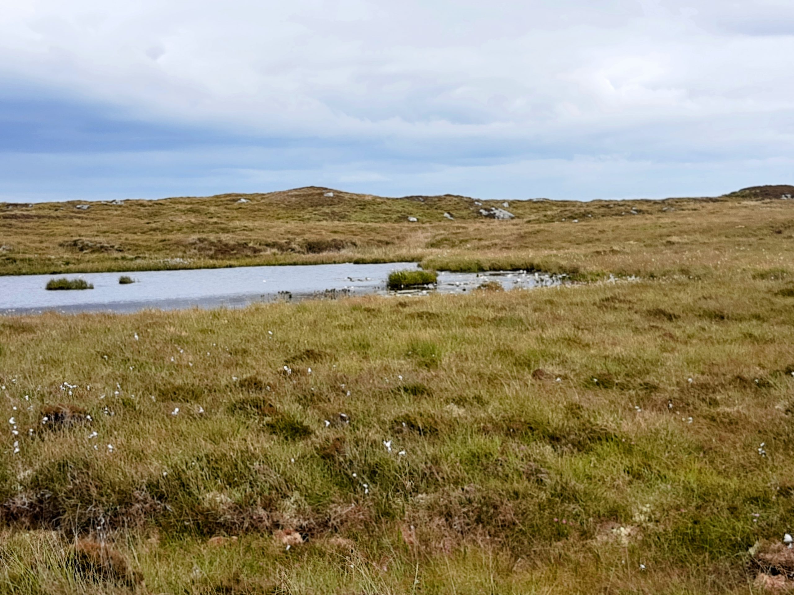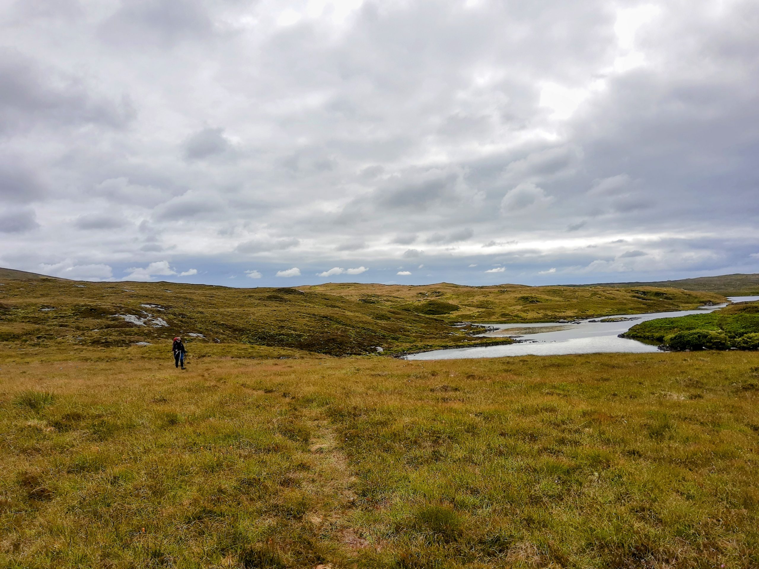 Unten setzen die Markierungspfosten zwar wieder ein, aber das Gelände war wieder eher schwierig. Wir mussten wegen des matschigen Untergrunds sehr aufpassen, wo wir hingetreten sind und auch viel von einer Stelle zur nächsten hüpfen. Aber insgesamt war das Stück ab dem Beginn des Tracks zum Ruabhal bis nach Gramsdale eines der schönsten bislang.