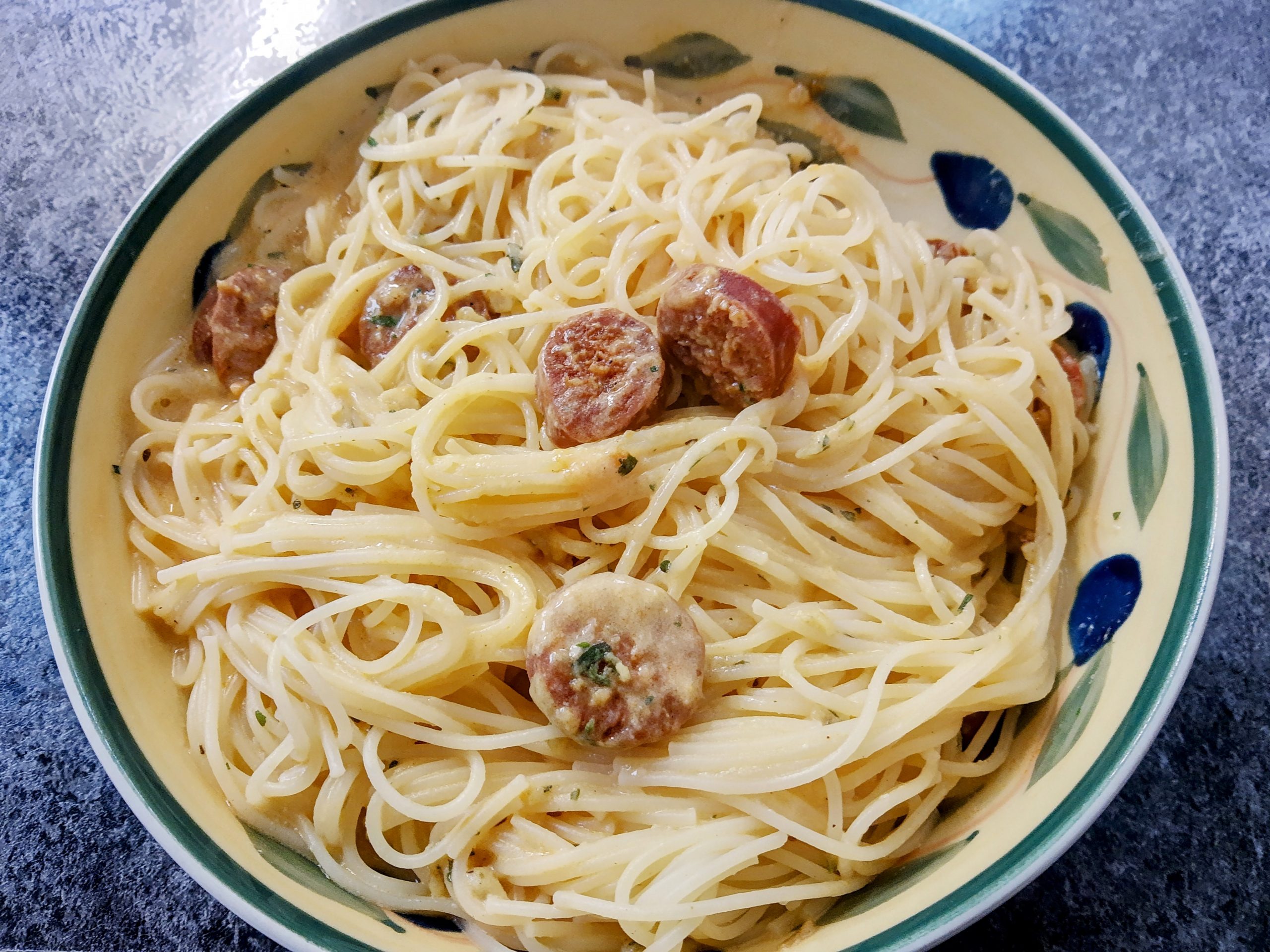 Bei Moorcroft Holidays gab es eine schöne Gemeinschaftsküche, sodass wir dort gekocht haben, statt unseren Kocher zu nutzen. Es gab mal wieder Spaghettini Carbonara mit Chorizo.