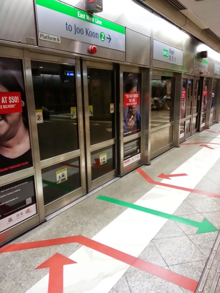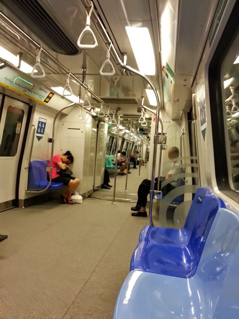 Heute morgen bin ich nach einer ziemlich schlaflosen Nacht schon um kurz vor sechs wieder aufgestanden und habe mich nach einem schnellen Frühstück mit Müsli, Toast, O-Saft und einem doppelten Espresso zu Fuß auf den Weg zur U-Bahnhaltestelle Bugis gemacht. Die U-Bahnhöfe in Singapur sind sehr modern – am Gleis ist eine Glaswand vor dem Graben, in dem die U-Bahn fährt und die Türen öffnen sich erst, wenn die U-Bahn steht. Außerdem ist auf dem Boden eingezeichnet, wo man stehen und warten soll 😉