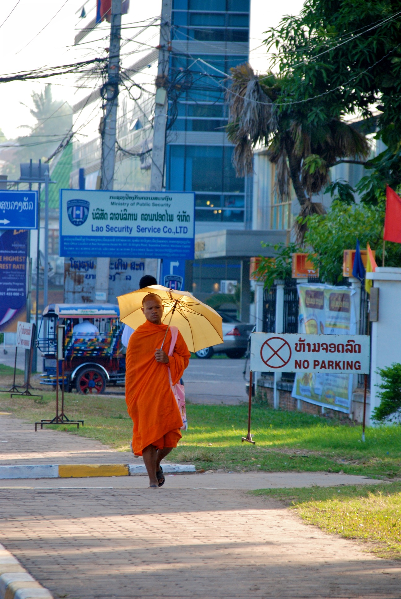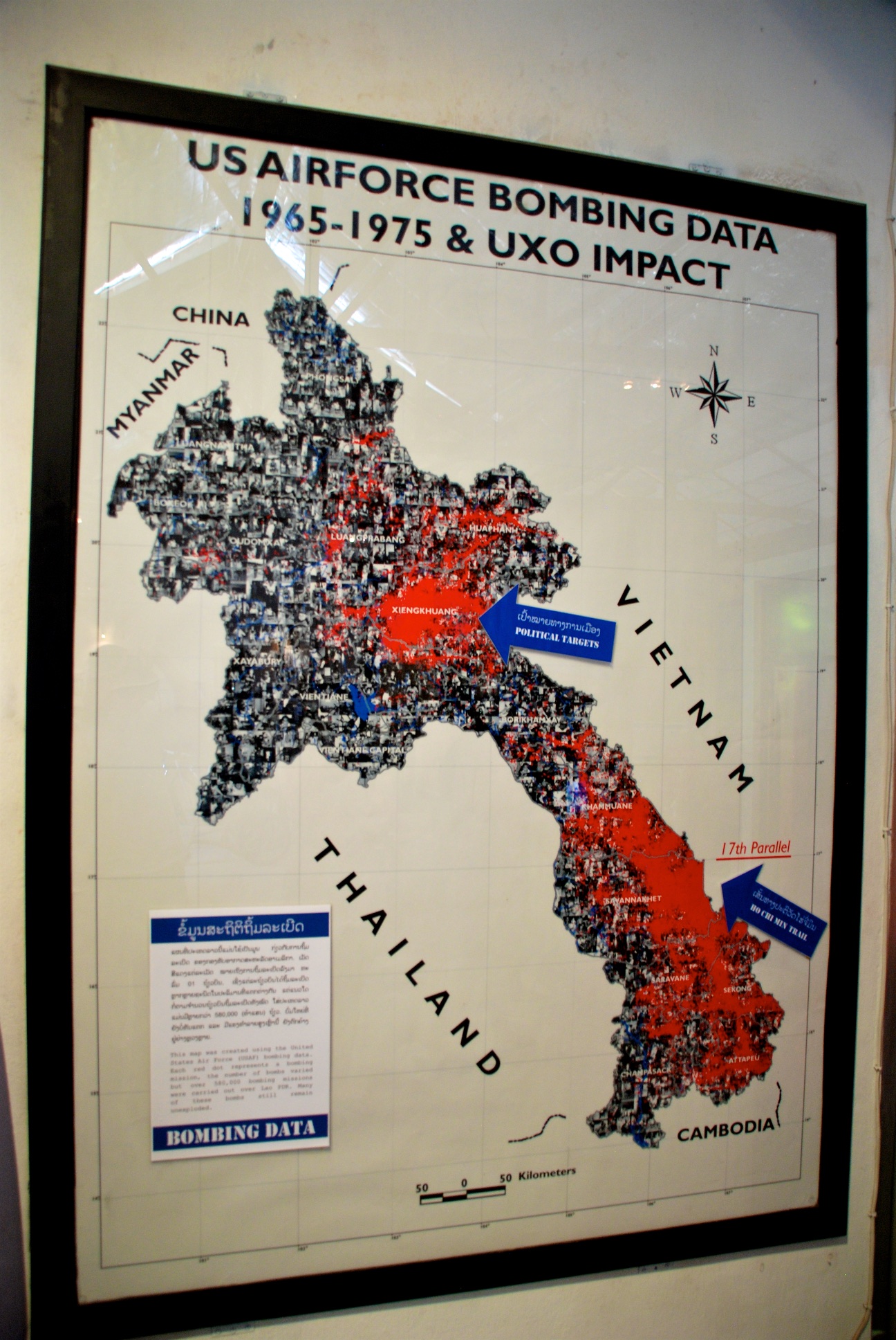 Danach ging es um 9 Uhr erstmal mit dem Bus zum COPE Centre. Dort werden Prothesen für Menschen hergestellt, die Opfer einer der vielen nicht explodierten Bomben geworden sind, die während des Vietnamkrieges von den Amerikanern über Laos abgeworfen wurden. Laos ist pro Kopf das am meisten bombardierte Land der Welt. Und dabei habe die USA offiziell nie Krieg gegen Laos geführt. Das Problem heute sind zum einen die vielen Streubomben („Bombies“), die aussehen wie kleine Bälle und deshalb häufig von spielenden Kindern aufgehoben werden, und die Tatsache, dass sich mit Altmetall auch hier viel Geld verdienen lässt, sodass viele Menschen mit Metalldetektoren losziehen, um Bombenreste zu suchen und diese dann zu verkaufen. Nur leider sind viele der Bomben beim Abwurf nicht explodiert und immer noch scharf. Aber selbst wenn die Menschen sich nicht aktiv auf die Suche nach Bombenresten machen, leben sie gefährlich. Viele der Bauern wissen, dass in ihren Feldern Blindgänger liegen, aber sie müssen ihre Felder trotzdem bestellen.