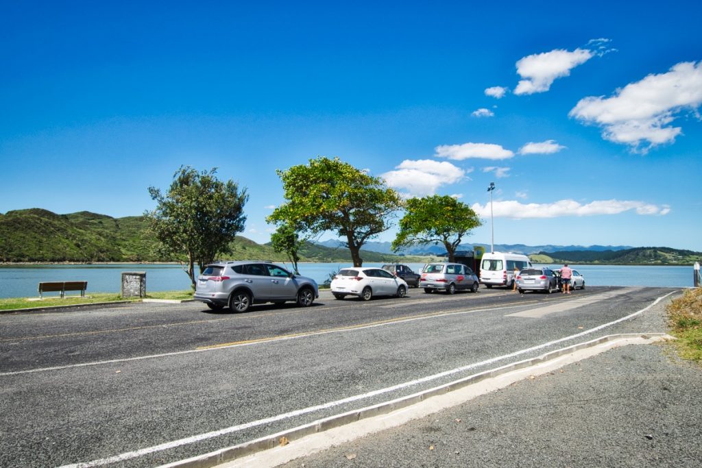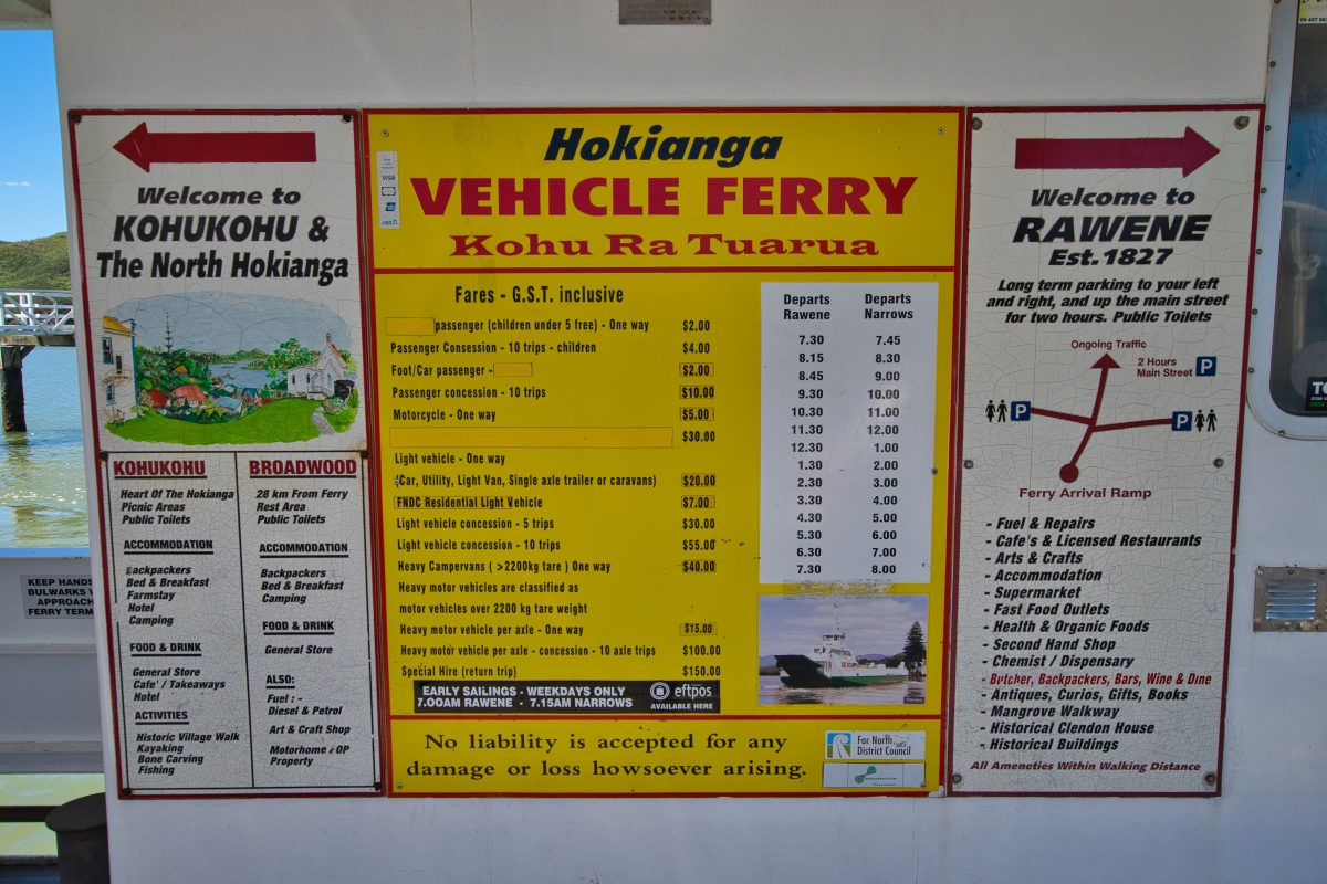 Die Überfahrt kostete 20 NZD und dauert nur etwa 15 Minuten. Von Rawene bin ich sofort weitergefahren, weil mich die Fahrt über die Schotterstraße doch sehr viel Zeit gekostet hat. In Opononi habe ich dann angehalten und mir bei der örtlichen Touristeninformation eine Karte geben lassen, in der alle Sehenswürdigkeiten im Waiopoua Kauri Forest eingezeichnet waren. Nachdem ich mir noch eine Thai Chicken Pie zum Mitnehmen gekauft hatte, bin ich auch schnell wieder weitergefahren.