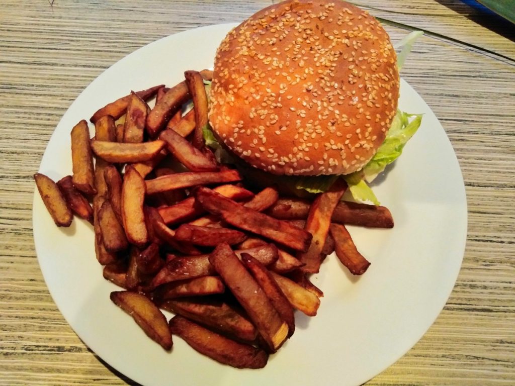 Zum Abendessen habe ich mir bei einem der örtlichen Takeaways einen Lamb Burger mit Kumara Chips, also Süßkartoffel-Pommes, geholt und mich damit in mein Häuschen gesetzt. Der Ausblick auf Mangawhai Heads war herrlich!