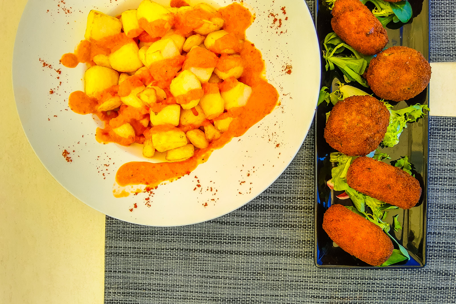 Auf der anderen Seite des Plateaus befinden sich eine Kirche und eine Herberge, zu der auch ein Restaurant gehört. Dort haben wir einen kleinen Mittagssnack eingenommen – unsere ersten Tapas. Leider waren weder die Croquettas noch die Patatas Bravas besonders gut – aber wir waren trotzdem dankbar, dass wir dort oben in der Sonne sitzen, etwas essen und uns ein wenig ausruhen konnten.