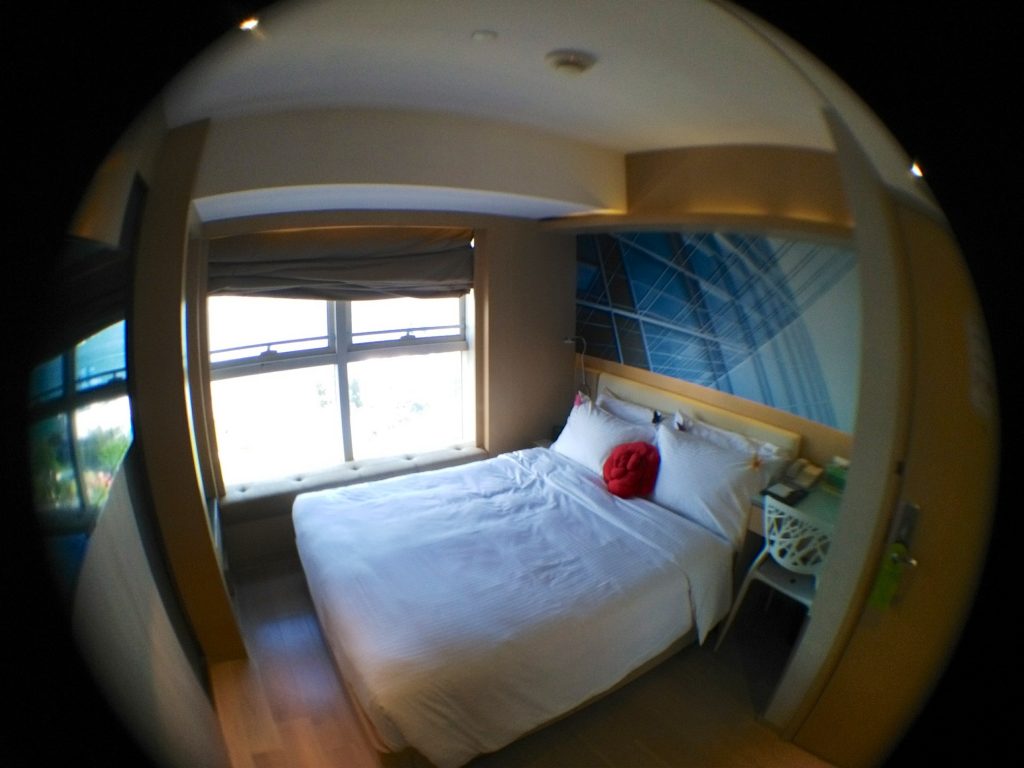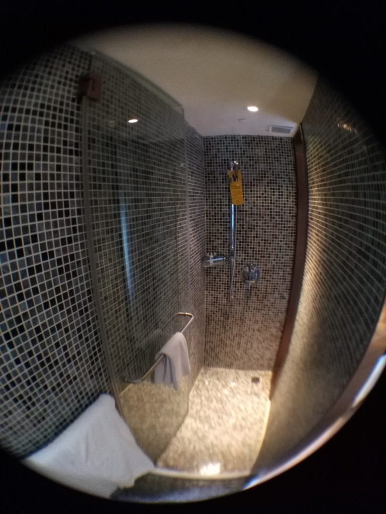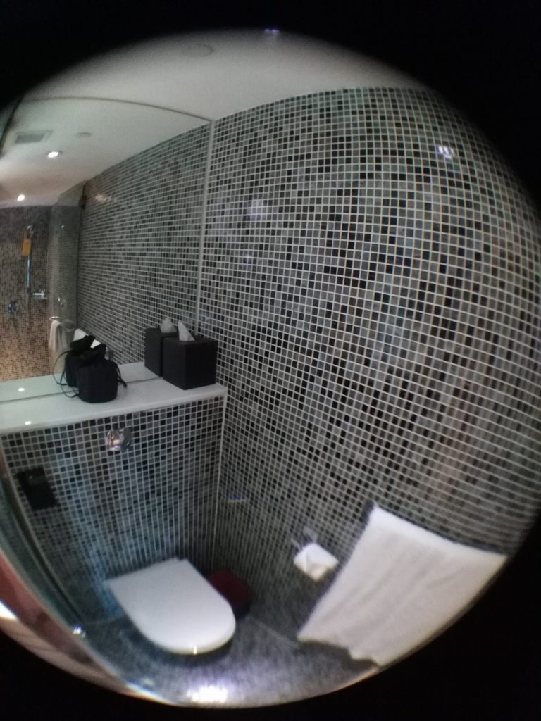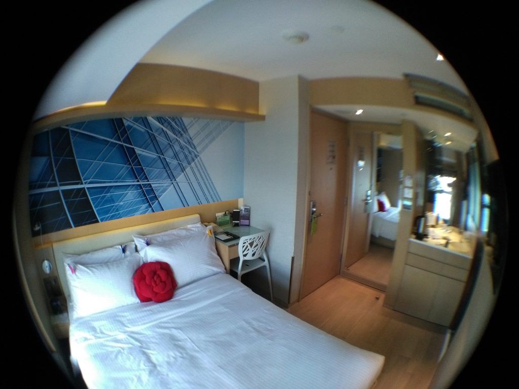 Vom Ibis Hong Kong Central, wo ich aus dem Minibus ausgestiegen bin, waren es weniger als fünf Minuten zu laufen zu meinem Hotel, dem „Butterfly on Waterfront“. Das Gebäude, in dem sich das Hotel befindet, ist super schmal. Da es so schmal ist, gibt es auf jeder Etage nur drei jeweils relativ kleine Zimmer. Aber das ist zum einen in Hongkong bei sehr vielen Hotels so und zum anderen war das Zimmer sehr durchdacht eingerichtet und gemütlich. Um davon einen Eindruck zu vermitteln, habe ich wieder ein paar Bilder mit dem Fisheye-Objektiv fürs Handy gemacht. Außer einem Schrank hatte das Zimmer alles, was man braucht. Statt Schrank gab es allerdings eine Nische mit Kleiderstange und eine Schublade unter dem Bett, in der man seine Sachen verstauen konnte. In einer weiteren Schublade unter dem Bett war der Safe untergebracht – sehr praktisch.