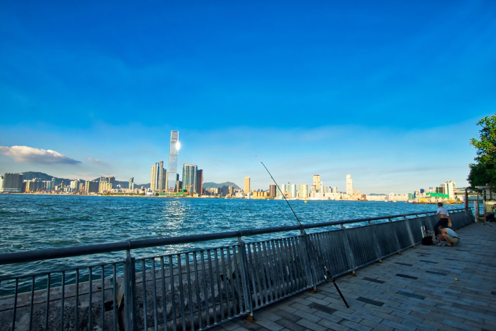 Von der Uferpromenade aus hat man einen sehr schönen Blick in Richtung Kowloon und bei einem Spaziergang entlang der Promenade kann man den Hongkongern dabei zu sehen, wie sie ihren Hobbys nachgehen – zum Beispiel Angeln.