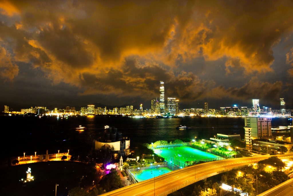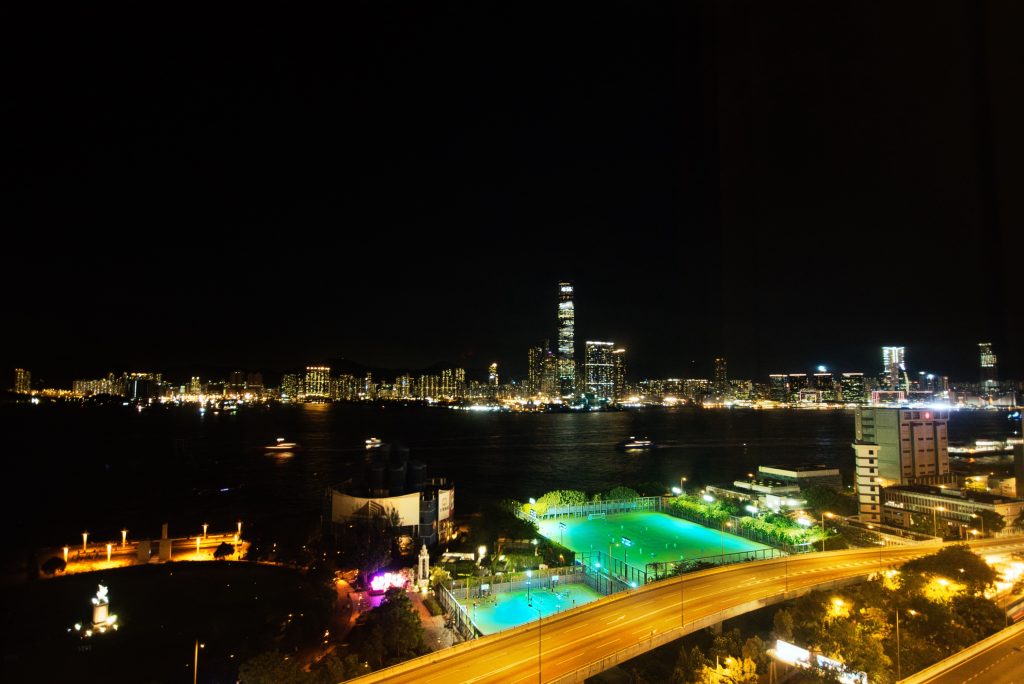 Nach dem Essen bin ich in einem großen Bogen über die Hollywood Road, vorbei am Man Mo-Tempel, wieder zurück zu meinem Hotel gelaufen. Von dort wollte ich mir die allabendliche Lichtshow ansehen, bei der die Hochhäuser in Kowloon und Central rund um den Victoria Harbour zu Musik, die im Radio übertragen wird, abwechselnd bunt bedeutet werden. Leider konnte ich von meinem Fenster entweder nicht weit genug in Richtung Victoria Harbour gucken oder die Lichtshow ist an diesem Abend ganz ausgefallen. Jedenfalls habe ich nichts gesehen. Dafür habe ich ein paar Nachtaufnahmen vom Ausblick von meinem Hotelzimmer aus gemacht.