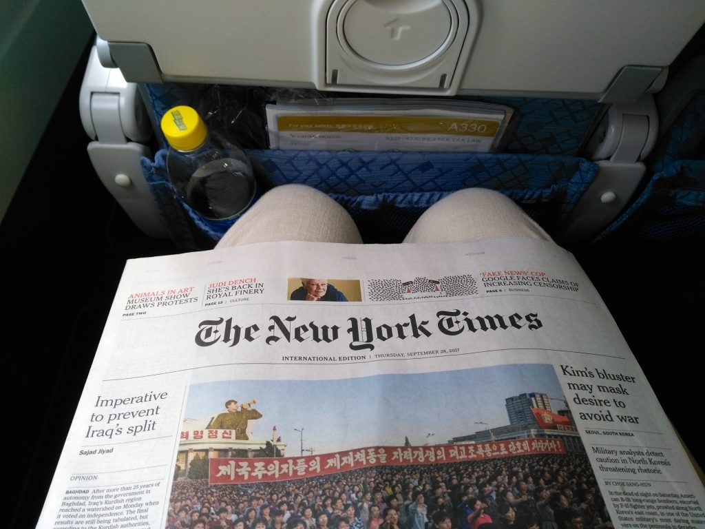 Das Boarding startete pünktlich und beim Einsteigen gab es sogar westliche Zeitungen, sodass ich mir eine New York Times für den Flug mitgenommen habe.