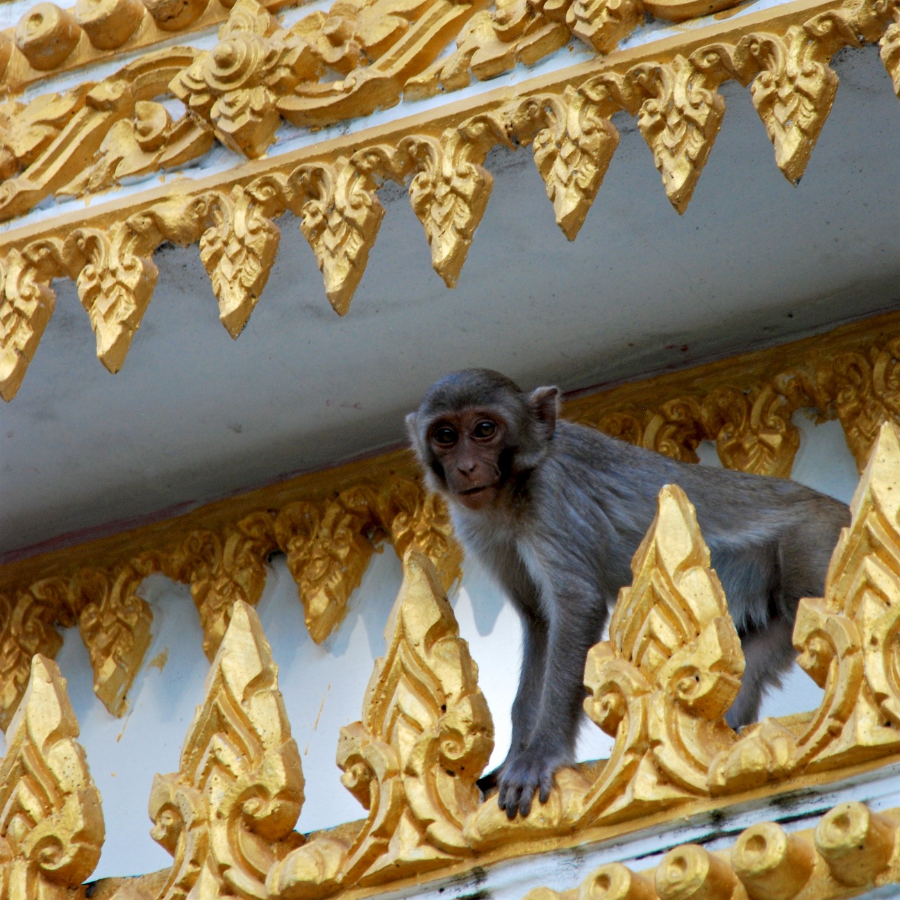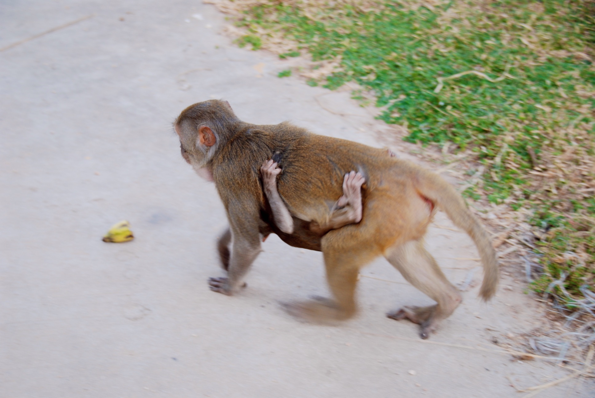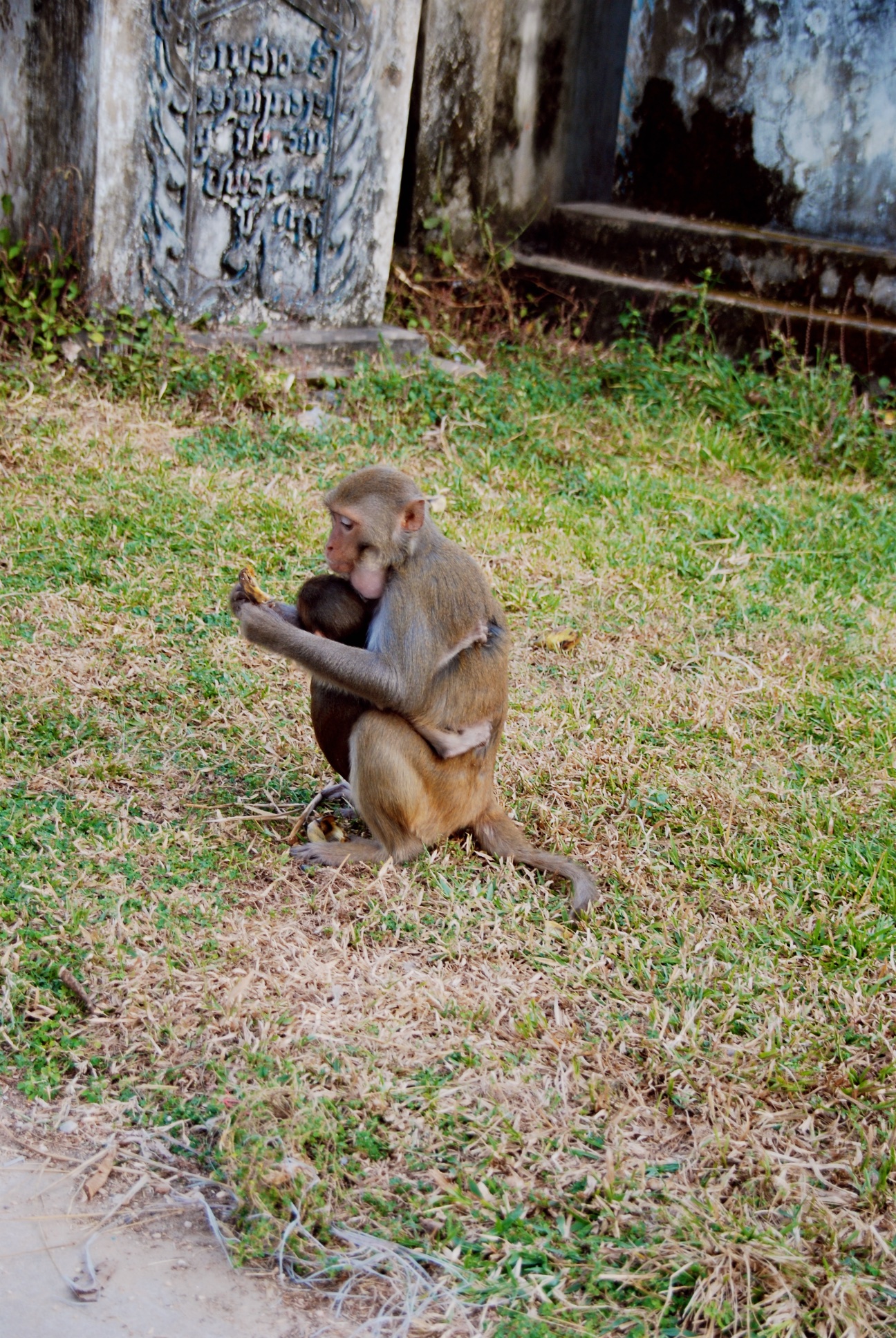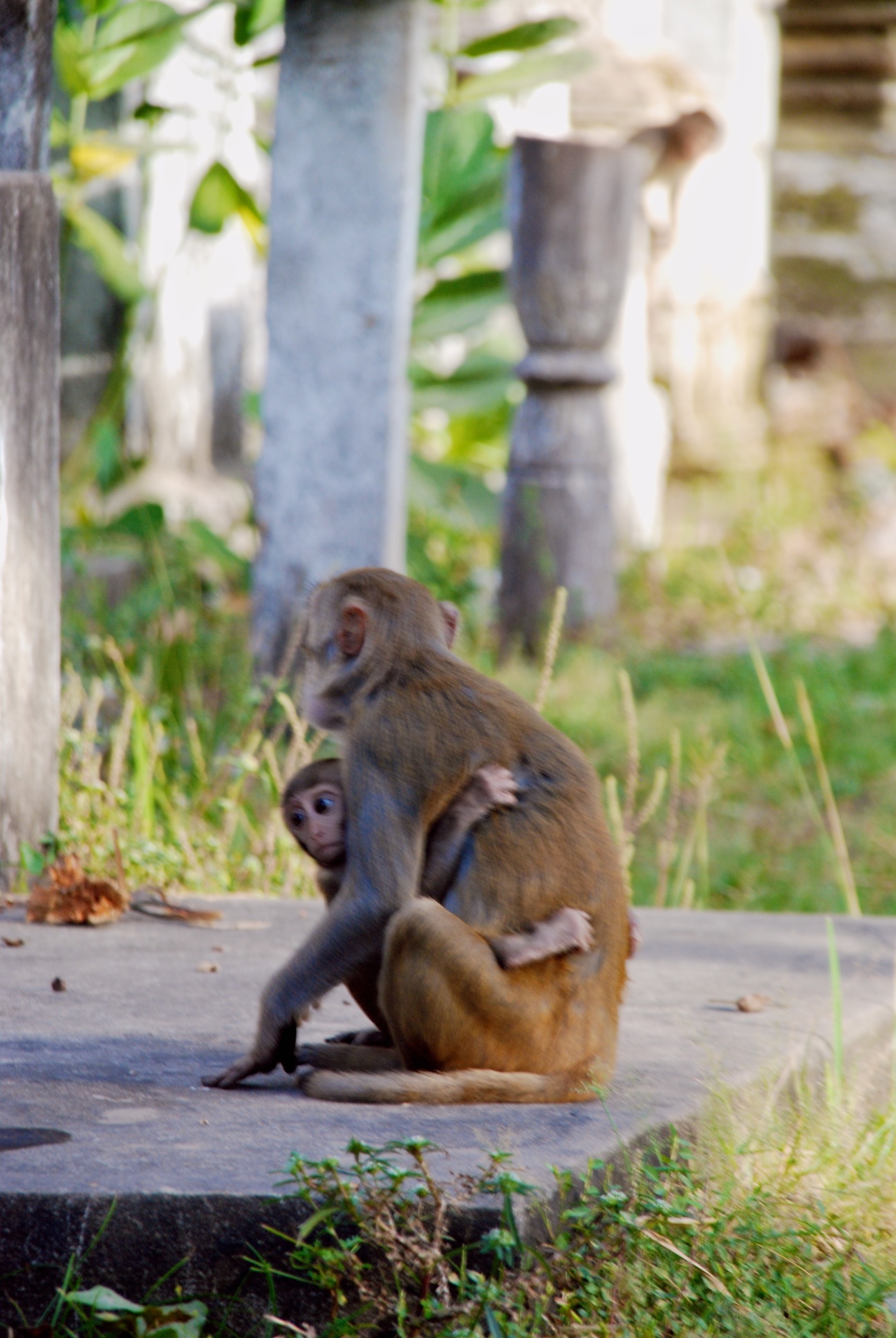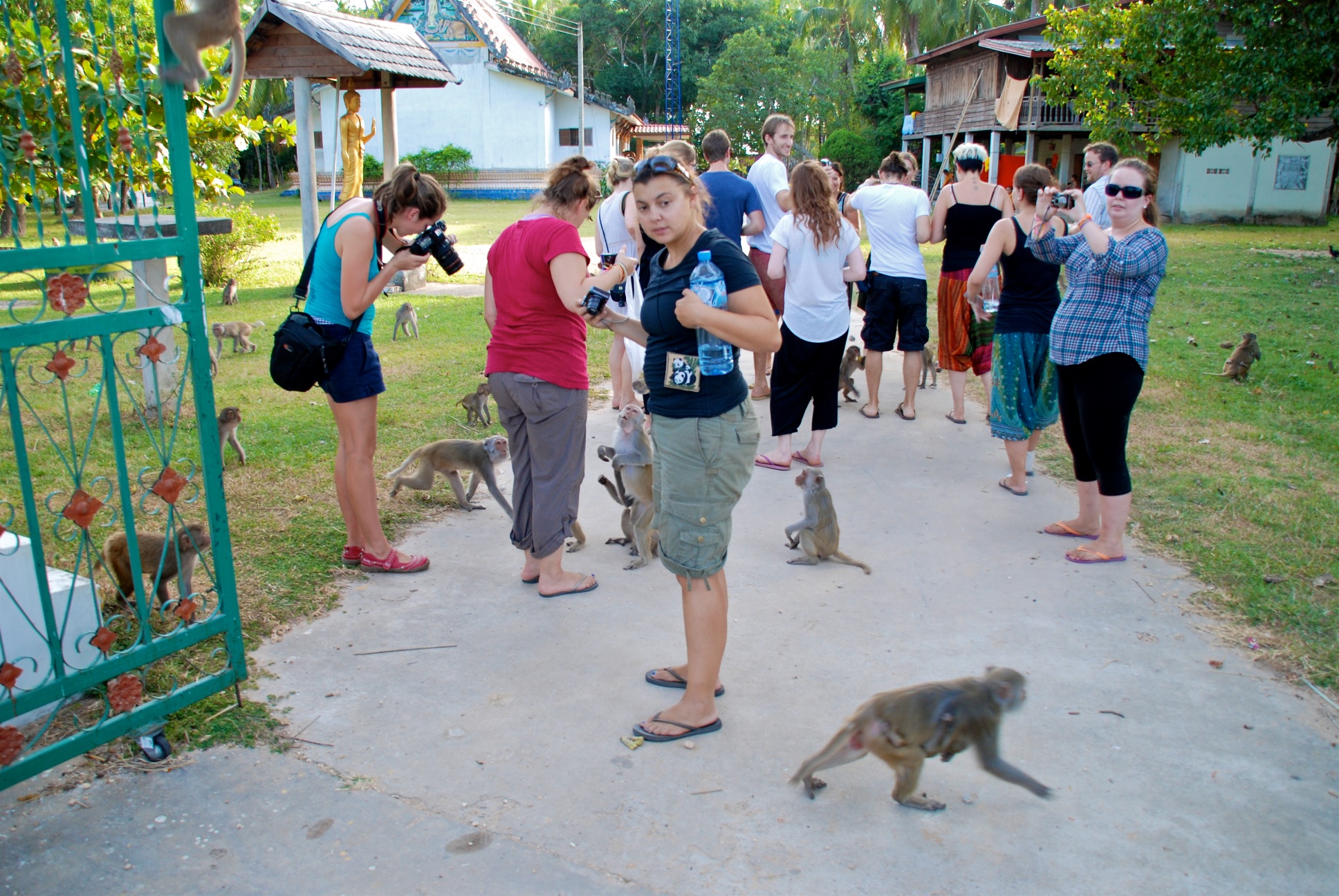 Vor dem Abendessen haben wir noch einen Spaziergang zum örtlichen Tempel gemacht, der außer von Mönchen auch noch von einer Horde Tempelaffen bewohnt wird. Für diese waren die morgens erworbenen Bananen gedacht. Ich habe mich allerdings zurückgehalten, weil ich keine Lust hatte, von einem übereifrigen Affen gebissen oder gekratzt zu werden. Dafür habe ich umso mehr fotografiert. Zum Tempel war uns eine ganze Schar Kinder gefolgt, die es wieder unwahrscheinlich lustig fanden, sich fotografieren zu lassen und anschließend ihr eigenes Gesicht auf dem Display zu sehen.