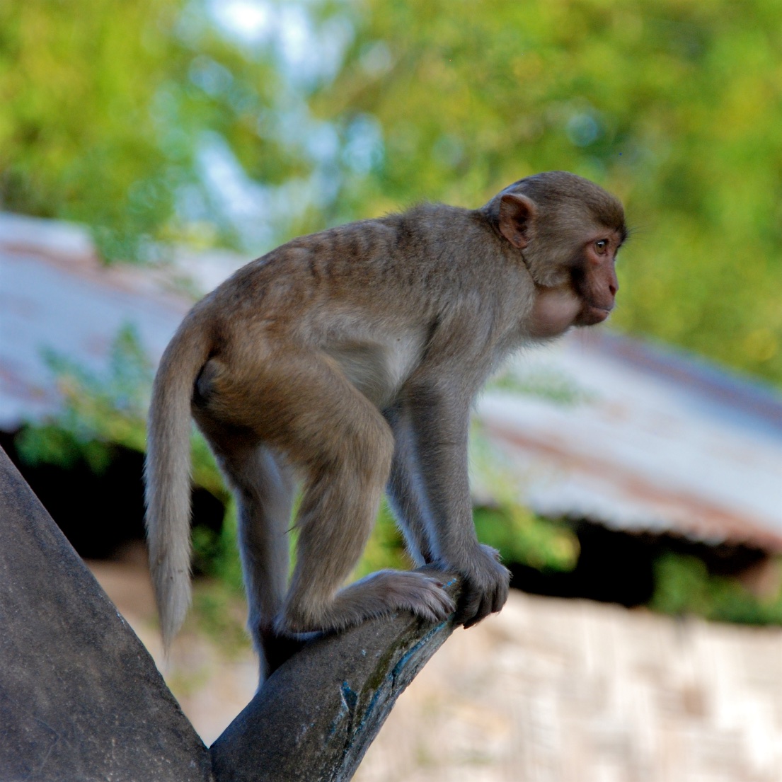 Danach ging es dann weiter zum Homestay. Allerdings konnte der Bus nicht bis ins Dorf fahren. Wir mussten aussteigen, mit einem ziemlich notleidend aussehenden Boot über den Fluss übersetzen und dann noch ein Stückchen laufen. Bereits auf dem Weg konnten wir die erste Affen hören und sehen – wir übernachteten nämlich im Monkey Forest.