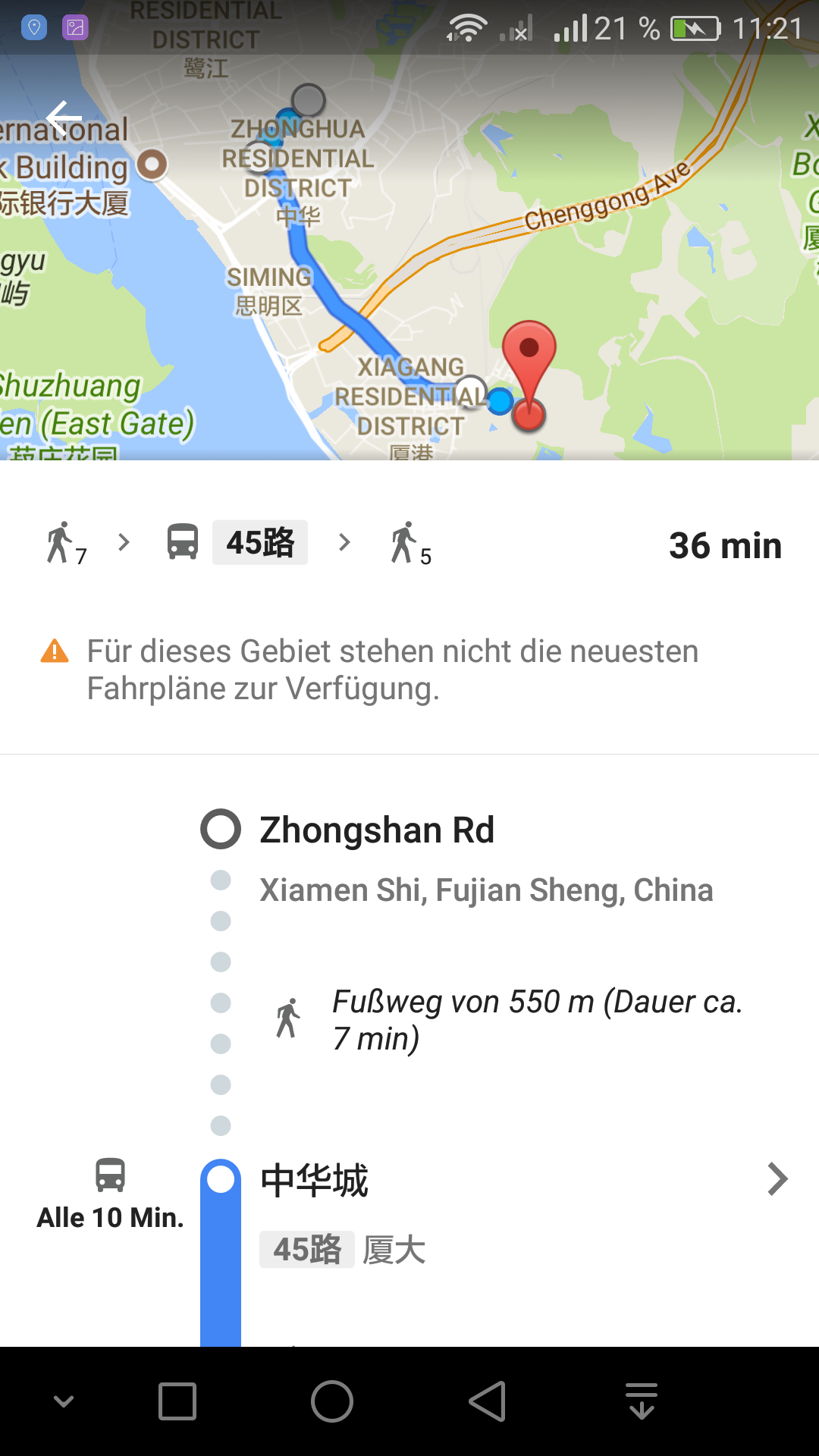 Gegen 11 Uhr habe ich an der Siming South Road den Bus Richtung Xiamen University genommen. Wie ich dort hinkomme und welchen Bus ich nehmen muss, habe ich vorher bei Google Maps nachgeschaut. Ich kann gar nicht oft genug sagen, wie hilfreich Google Maps selbst in China ist. Man könnte ja meinen, dass Google Maps in China, wo man es nur mit Hilfe eines VPN oder einer ausländischen SIM-Karte nutzen kann, nicht mehr Informationen liefert als die „einfachen“ Kartendaten. Aber weit gefehlt: wie ich schon in Peking und Shanghai festgestellt hatte, liefert Google Maps auch Informationen zum öffentlichen Nahverkehr. Und zwar selbst in Xiamen! Zwar erscheint immer eine Nachricht, dass die Informationen nicht mehr aktuell sein könnten, aber bislang haben jedenfalls die Routeninformationen, sprich die Bus- bzw. U-Bahn-Linien und die Haltestellen, gestimmt und wenn die Abfahrtszeiten nicht ganz stimmen, kann man ja auch einfach auf den nächsten Bus oder die nächste Bahn warten.