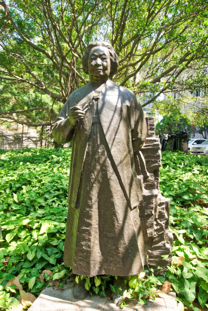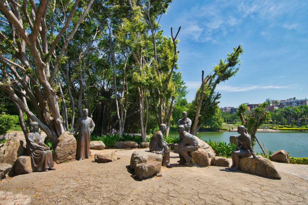 Am Ufer des Sees steht eine Gruppe von Skulpturen – ich denke es soll eine Gruppe von Studenten und/oder Gelehrten im Gespräch darstellen. Auf dem Campus finden sich an anderer Stelle noch eine ganze Reihe weiterer derartiger Skulpturen.