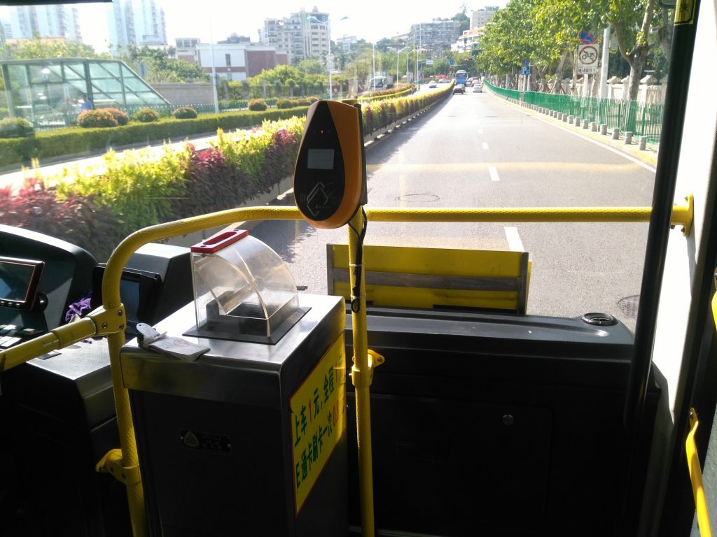 Die Busfahrt dauerte deutlich weniger lange, als Google Maps vorhergesagt hatte, was daran gelegen haben mag, dass der Bus auf einem Großteil der Strecke seine eigene Spur hatte und so nicht im Verkehr stecken blieb. Auf dem nächsten Bild kann man im Übrigen sehen, wie das Bezahlen im Bus funktioniert: entweder man hat eine Chipkarte mit Guthaben, die man an das Kartenlesegerät hält, oder man wirft einfach 1 Yuan in die Münzbox und nimmt sich ein Ticket bzw. einen Beleg.