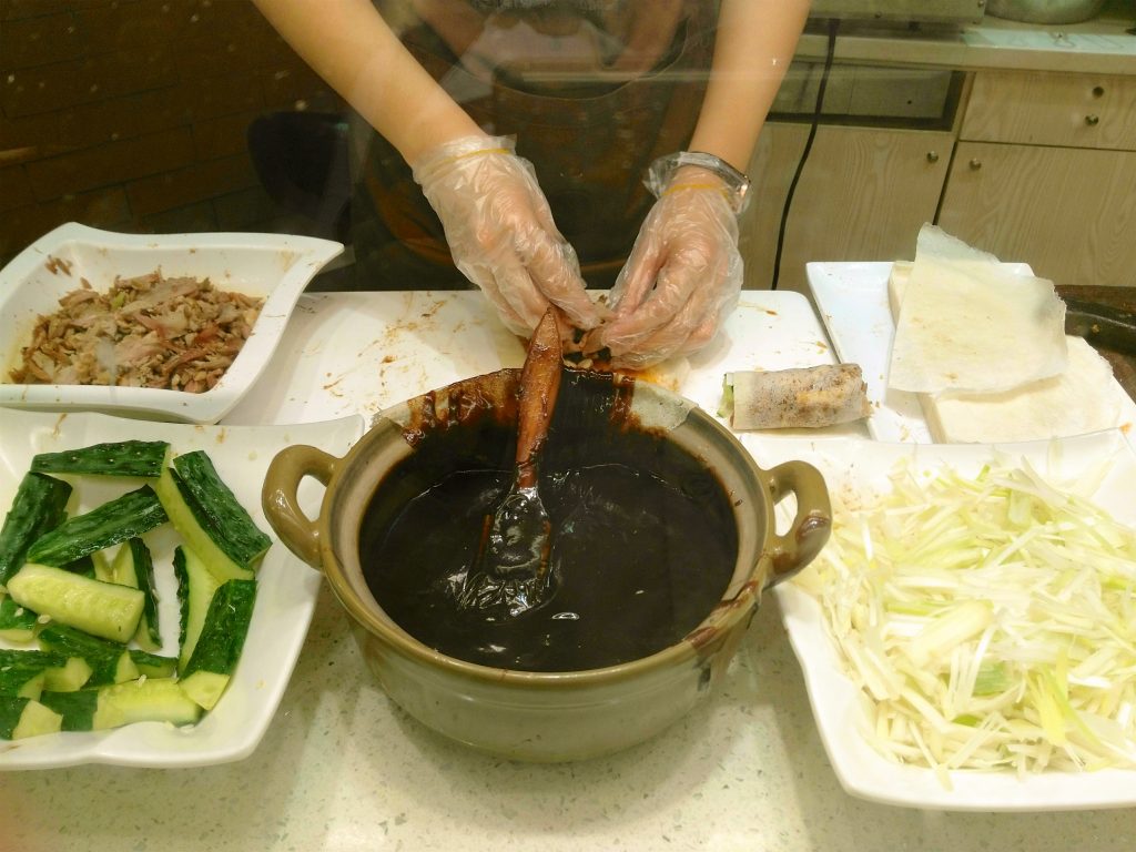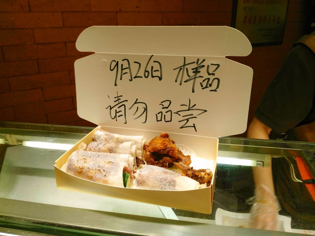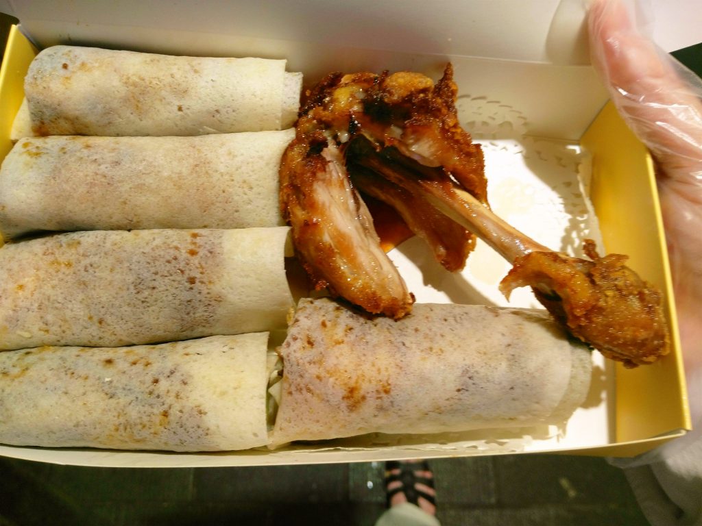 Nach dem Essen habe ich die nächste Fähre zurück nach Xiamen genommen. Dort habe ich dann bei Brazen Duck eine Snack Box mit Wraps gefüllt mit Ente und einer Hühnerkeule bestellt. Im Gegensatz zu der Suppe auf Gulangyu war dies sehr lecker und auch die lange Wartezeit wert, während der ich der Verkäuferin beim Herstellen der Wraps zuschauen konnte.