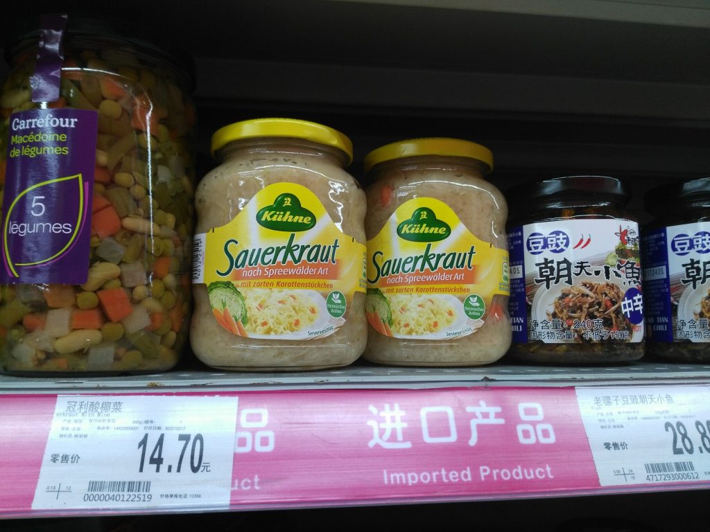Anschließend bin ich zu Carrefour gegangen, um für Rainer nach einer Sauer-Scharf-Suppe von Maggi zu suchen. Aber es gab sie auch hier nicht. Dabei mangelte es beim Carrefour in Xiamen keineswegs an deutschen Produkten.