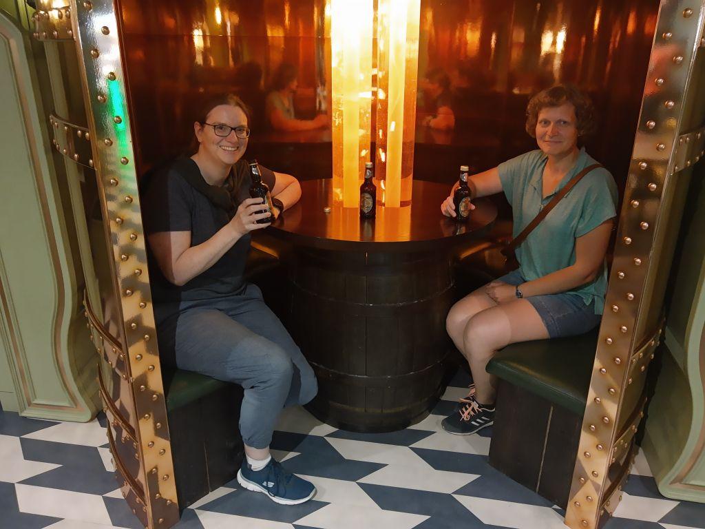 Am Ende der Ausstellung gab es eine kleine Cafeteria mit Bar, bei der man Bottled Butterbeer kaufen konnte. Wir habe uns je eine Flasche gegönnt. Es schmeckte sehr süß und nach Karamell – mir hat es geschmeckt, Katharina fand es zu süß.